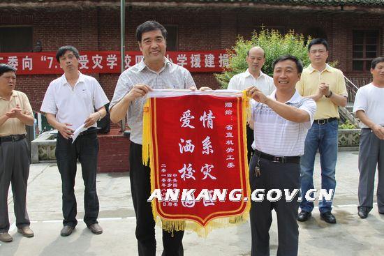 随后,在四季小学校园举行了“省直机关工委向“7.18”受灾学校四季小学援建捐赠仪式”,李顺民代表省直机关工委向岚皋县委、县政府捐赠30万元,并作了深情的慰问讲话,他希望把捐赠的这笔资金全部用于四季小学的灾后重建,有关部门要科学设计规划,精心组织施工,确保工程质量,提高学校硬件和管理水平,切实把这所援建学校建设好。岚皋县委副书记陈稳代表县委、县政府向省直机关工委致答谢词,县委县政府回赠了答谢牌匾,四季乡党委政府回赠了爱心锦旗。该校一名小学生向李顺民书记献上了自己的图画作品,以此表达对李顺民和省直机关工委的感激之情。