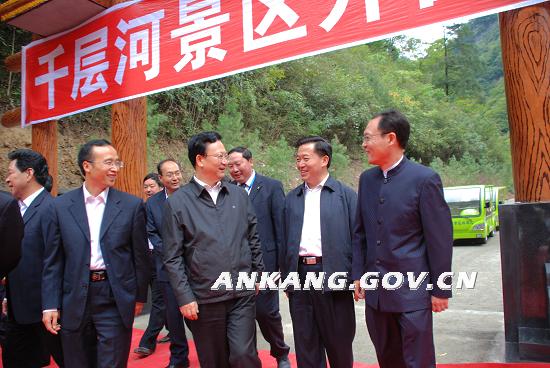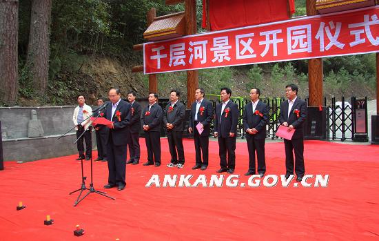 9月26日下午,岚皋县千层河景区开园揭牌仪式举行,副省长景俊海,市长方玮峰,省旅游局副局长陈清亮,市委常委、常务副市长徐启方,市人大常委会副主任吴德珠,市长助理、市旅游局局长王汉琳等出席揭牌仪式。