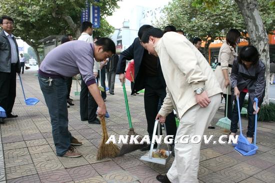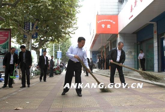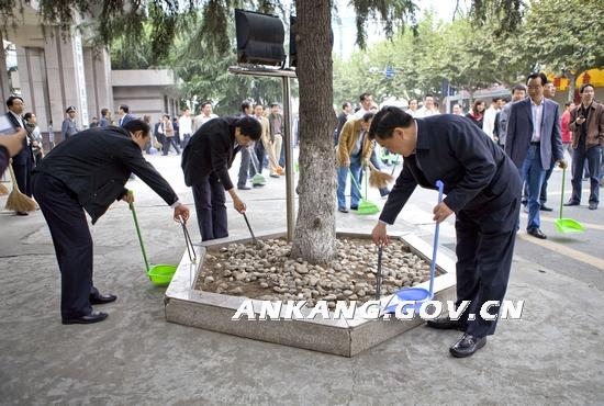 为了以优美的环境迎接2010年国庆节,9月30日上午,方玮峰、徐启方、何少华、巨拴科、王安利、薛建兴、张全明、陈明等市上领导带领28个市政府相关部门干部职工清除街上垃圾杂物和杂草,以实际行动来响应市委、市政府及市双创办号召的在安康中心城区开展节前义务大清扫活动。