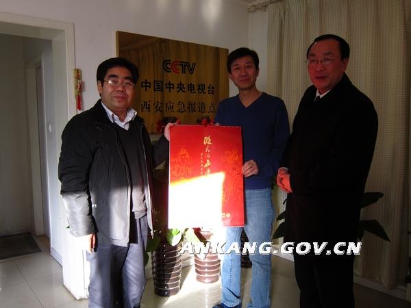 在中央电视台陕西应急报道点,钟顺虎向驻地工作人员每人都送上了一套精美的书法作品挂历,代表市委、市政府对中央电视台多年来对安康的大力支持表示真诚感谢,并向应急报道点介绍安康的经济社会发展情况,随后又就近期安康市全面营造“十二五”宣传氛围、深度挖掘典型人物事迹和大力宣传安康灾后重建、农民进城安居以及推介民间传统文化的宣传重点进行交流。