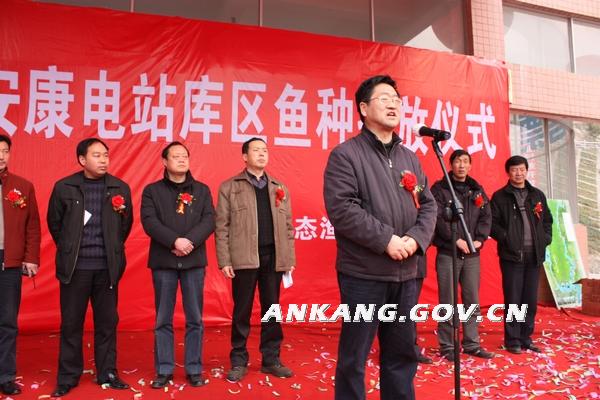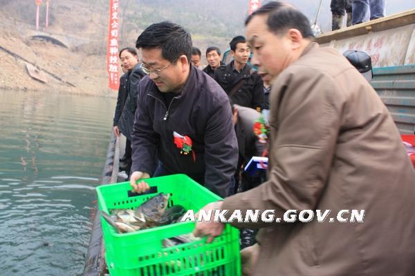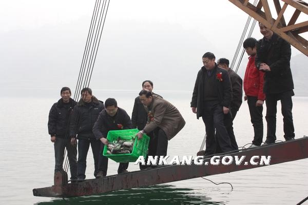 1月28日上午,安康电站库区鱼种放流仪式在瀛湖之滨隆重举行,市人大常委会副主任马涛宣布鱼种放流开始。