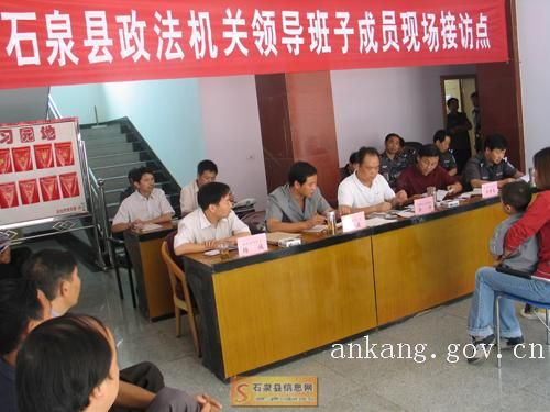 为进一步深化政法机关“大接访”活动深入开展,认真听取群众意见和建议,由县委政法委牵头,石泉县公、检、法、司4政法部门共同进行的联合大接访,9月7日上午9时在石泉县城关派出所开始,共持续长达8小时,处理上访11宗,其中1宗当场解决。4个政法部门汇集一堂联合接访,在石泉尚属首次。