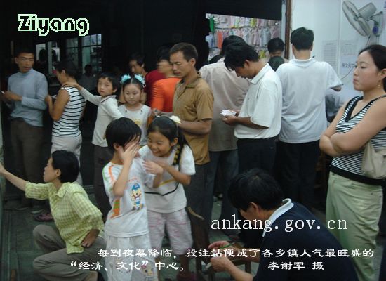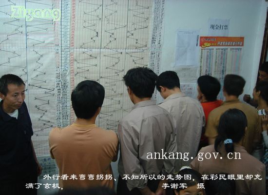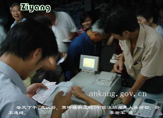 蒿坪镇是紫阳县经济条件相对比较好的一个集镇,它地处恒紫公路和蒿汉公路的交会处。这里,店铺林立,市场贸易繁荣,有陕南乌克兰之称,与之相邻的汉滨区、汉阴县曾在此举行过商贸交易会。从今年元月彩票在该镇设点销售以来,立即得到市场青睐,并呈阶段性迅猛增长,特别是在今年五、六、七3个月里,彩民失去理性地跟风购买几近疯狂。 干部买,居民买,农民买,连中小学生省下早点钱也要去碰碰运气。一名下岗职工告诉记者,她在不到半个月的时间里,把几年来起早贪黑做点小生意挣来的4万块钱全部投了进去,血本无归,在床上大病了一场。问她为什么要这样不顾后果的购买。她叹息一声说,那时节,人都疯了,只想到买彩票回报大,投进去的钱总会成倍的返还回来,便不顾一切的每天翻倍地去包点包号,栽的越深,下的注就越大,总想一把反水,到最后整个人的精神都崩溃了。她停顿了一下说,每天下午7点以后,蒿坪街上的三个投注站里三层外三层围满了人,挤不通缝。街上生意冷清,6块多钱一斤的肉卖到4块钱一斤,问都没有人问。在蒿坪街上,记者看到,街上相当一些店铺的墙上挂满了彩票走势图,甚至一些居民的客厅里也挂上了彩票走势图,街上的行人,门前的住户手里拿着纸片,都在悉心研究彩票。家住蒿坪下街的吴某,全家两代人迷上了彩票,最初中了奖,尝到了甜头,相互埋怨买少了,便决定放开了买,一下栽进去七、八万块钱,又互相埋怨发了疯了,从此家里吵闹不止。在蒿坪镇政府,镇长张彬告诉记者,今年蒿坪镇将近1千万元的彩票销售量中,个体私营老板占到七成以上,给该镇民营经济的后续发展带来了很大的影响。