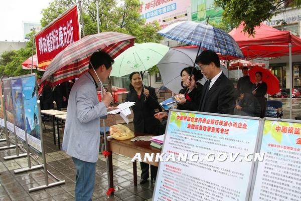 4月12日上午,由安康银监分局组织的,为期一个月的“安康银行业小微企业金融服务宣传月”活动启动仪式在白天鹅广场冒雨举行。