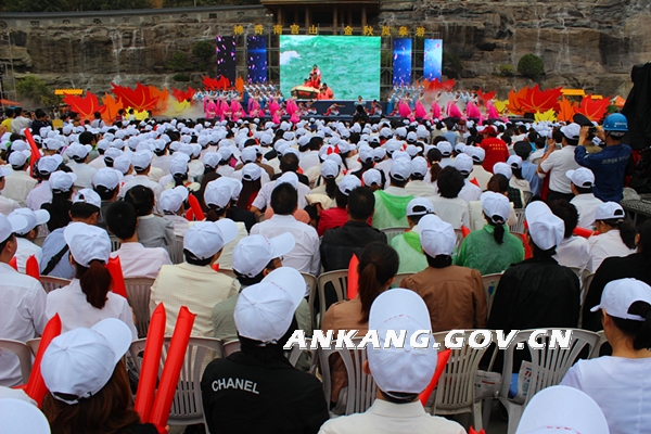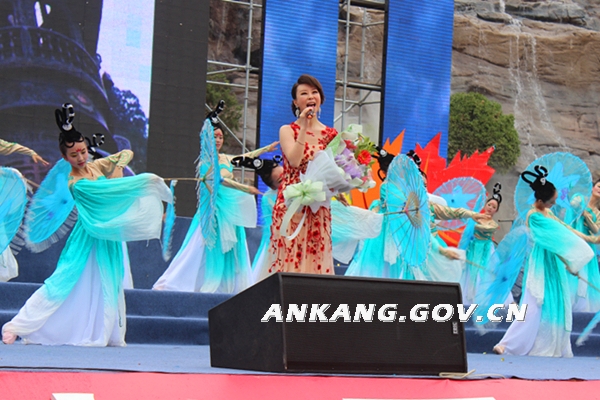 竹筏、荷花、艄公、美女......汉调二黄《相约岚河》让观众大饱眼福,让人们在领略岚河优美风光的同时,也感受到了跳动的文化脉搏。乐舞《水舞千层河 乐动南宫山》、舞蹈《荷颂》及歌舞《如诗如画南宫山》,将千层河的清、秀、幽与南宫山的雄、奇、险淋漓尽致的展现在观众眼前,把灵山秀水的神奇与美丽悄然根植在了每位观众的心里。一曲激昂嘹亮的《好运来》、与岚皋代表共唱《为了谁》以及在岚皋广为传唱的歌曲《神奇美丽南宫山》,著名女歌唱家、国家一级演员祖海的精彩演出让现场的掌声与欢呼声连绵不绝,甜美悠扬的歌声、跌宕起伏的旋律将整台演出推向了高潮。由岚皋本地歌手带来的民歌联唱《山歌悠长茶飘香》、《山歌不唱冷秋秋》、《六口茶》等一首首脍炙人口的岚皋原生态民歌,词曲新颖、婉转清畅,如天籁之音娓娓道来,既有浓郁的岚皋地方特色,又不失民歌独有韵味,充分体现了岚皋民歌的无穷魅力,展现了岚皋丰富多彩的人文风情。由省杂技团表演的杂技抖空竹《腾飞的岚皋》高潮迭起,惊险不断,演员们用抖、抛、甩等动作,时而扔高、时而串绕、时而坐地双劈,丰富的表情和娴熟的动作让现场观众无不屏气凝神、叹为观止。在激情飞扬的歌伴舞《山水岚皋邀您来》和现场观众热情的掌声中,整场文艺演出缓缓落下了帷幕。