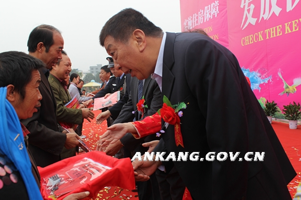 10月19日上午,安康市2012年度保障性租赁住房入住钥匙发放仪式在金州广场举行。市委常委、副市长王安利,市人大常委会副主任胡凯庆,市政协副主席黄秀玲出席仪式并为住房户发放了钥匙。来自汉滨区的180户家庭在仪式上领到了期盼已久的新家钥匙。