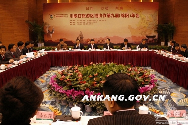 此次年会由四川省旅游局、陕西省旅游局、甘肃省旅游局主办,绵阳市委、市政府承办,年会以“资源共享、市场互推、信息互通、优势互补、互惠互利、共同发展”为主题,旨在分析旅游行业整体形势,共同研究指定区域旅游发展战略,交流旅游营销经验,加强川陕甘旅游资源整合推广力度,全面推进区域旅游业的合作,共建有吸引力和竞争力的旅游区域和区域旅游产品,带动川陕甘旅游及相关产业的快速发展,共赢共荣。