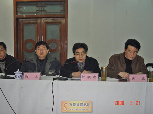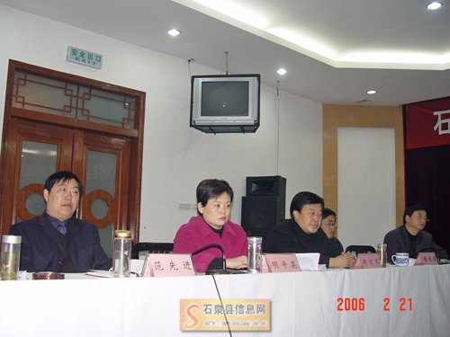 石泉县县长明平英、县委副书记胡吉应、县委副书记、纪委书记范先进、副县长陈先林在汇报会上