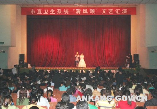 在全市掀起学习胡锦涛总书记关于树立以“八荣八耻”为主要内容的社会主义荣辱观活动的高潮时期,4月28日晚,市卫生局党委、市卫生局和卫生局纪委组织市直卫生系统广大干部职工,在安康职业技术学院东校区礼堂举办了“清风颂”文艺汇演晚会。晚会节目形式多样,有歌舞、快板、乐器演奏等。演员们的精彩演出使整台晚会不断推向高潮。