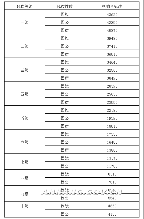 调整后,一级因战、因公、因病残疾军人抚恤金标准为每人每年43630元、42250元、40870元,分别比2012年提高了5690元、5510元、5330元。