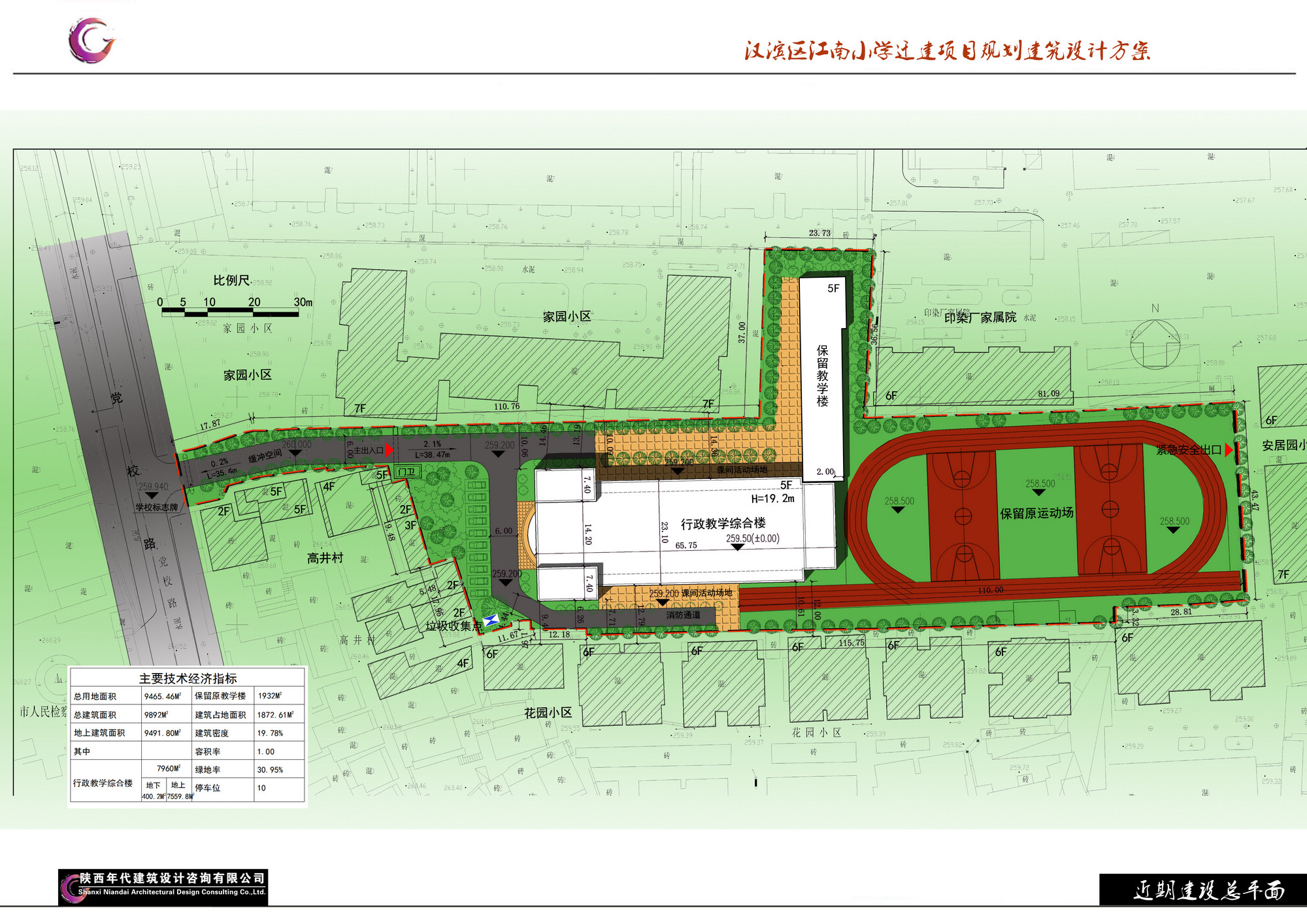 项目位于党校路原城关二中地界内,规划方案主要经济技术指标:总用地面积9465.46平方米,总建筑面积9892平方米,其中地上建筑面积9491.80平方米(拟建地上5层建筑面积7559.8平方米,保留原有建筑1932平方米),地下建筑面积400.2平方米。