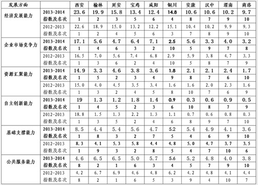 咸阳,企业市场竞争能力、资源汇聚能力、自主创新能力和公共服务能力四个方面的总指数及其中的绝大部分指标均处于全省中上游水平,省名牌产品和著名商标、进出口总额、规模以上工业企业单位数和经营效益、非公有制经济占GDP比重、省级以上企业技术中心数、人均固定资产投资额、每万人拥有高等学校在校大学生数、实际使用外资额、省级以上科技成果、全年专利申请量、R&D人员全时当量、省级以上开发区产业实施项目完成投资额、千人医生数、万人教师数、政府办事效率满意度等指标表现较好;经济发展能力和基础支撑能力分居全省第6、7位,受到了产业结构水平、森林覆盖率、单位GDP工业废水排放量、人均二级以上公路里程等指标的影响。对比上年,六个发展方面都获得了不同程度进步,人均GDP、人均社会消费品零售额、省名牌产品和著名商标、全员劳动生产率、人均固定资产投资额、实际使用外资额、全年专利申请量、R&D人员全时当量、省级以上开发区产业实施项目完成投资额、人均医疗卫生支出、政府办事效率满意度等指标进步较大。