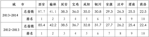 全省综合竞争活力水平较上年小幅提升。2013—2014年度,陕西省综合竞争活力指数37.2,比上一年提高0.3,增速0.9%。十个市排名从高到低依次是:西安87.7、榆林41.1、延安38.3、宝鸡36、咸阳35、铜川30.8、安康29.3、汉中26.3、渭南25.5、商洛22.5,排名与上年一致,其中铜川、宝鸡、延安、榆林出现小幅下降。