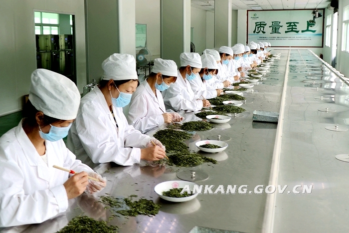 紫阳县盘龙富硒绿茶有限公司的职工正在“选茶”