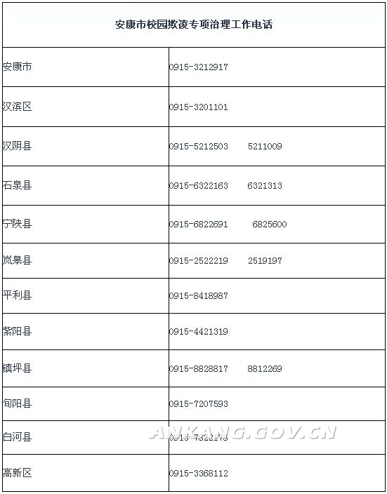 | 内容概述 | 安康市校园欺凌专项治理工作电话 | ||