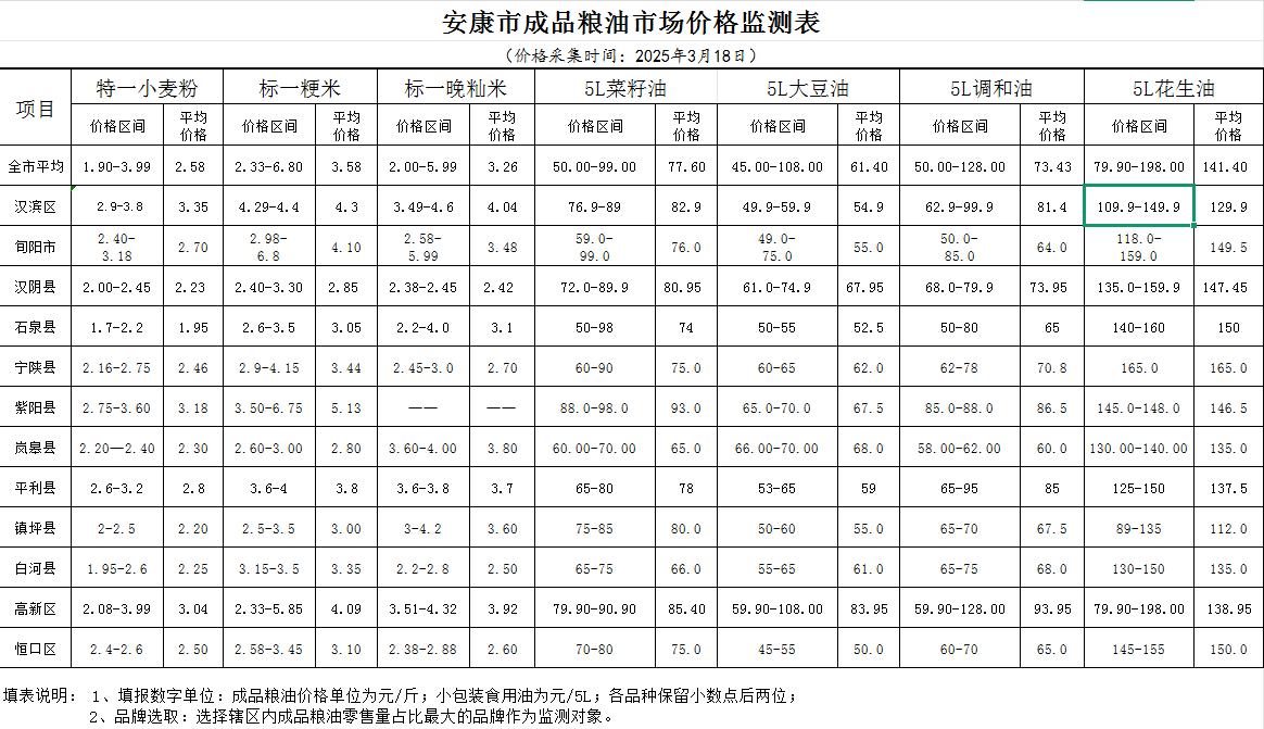 安康市粮油市场价格监测表(2025年3月18日)