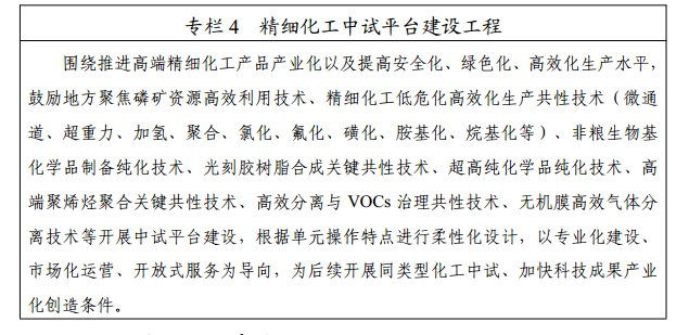 布局建设创新平台。加强精细化工领域国家重点实验室和制造业创新中心建设,发挥相关产业创新联盟作用,推动产学研用深入融合,促进上下游协同创新和生产应用示范引领。围绕精细化工低危化工艺、高效分离、纯化等关键共性技术研究布局一批中试平台,提升公共服务能力。推进中试项目落地。制定化工中试装置建设管理规范,强化产业、应急、环保等政策协同,基于专业化评价进一步优化化工中试装置安评、环评工作,鼓励化工园区建设规范的中试车间、标准厂房,积极开展关键工序和新工艺中试,推动研发成果加快转化为生产力。促进上下游协同创新。引导产业链龙头企业联合相关企业、高校、院所等组建产学研用创新联合体,以产业需求和技术迭代为牵引开展链式协同创新,加快新技术、新产品和新装备协同攻关、验证和应用,全面提升产业链基础能力。持续推进高压电缆绝缘及屏蔽材料、电子特气、微通道等先进技术及产品“一条龙”应用示范。
